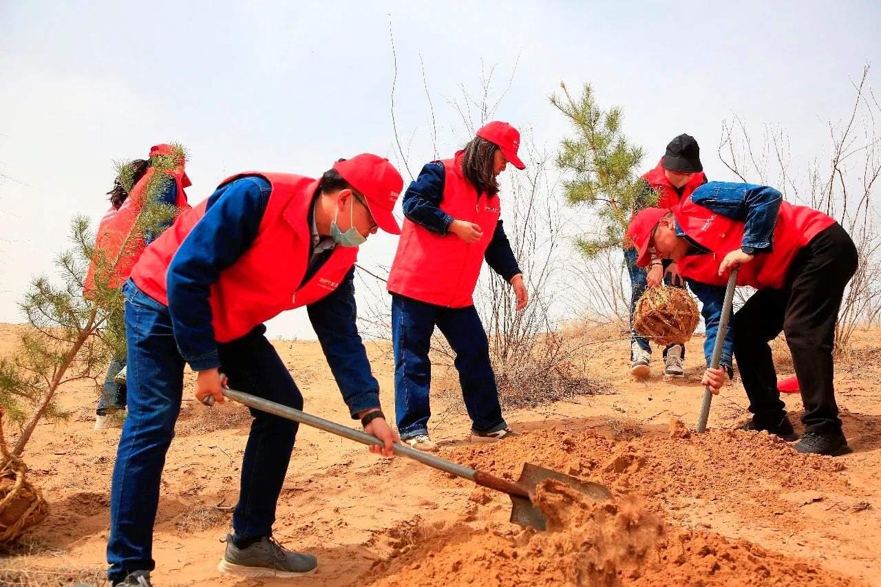 △2023年4月12日,志愿者在寧夏靈武白芨灘國家級自然保護區(qū)開展義務(wù)植樹、扎草方格。