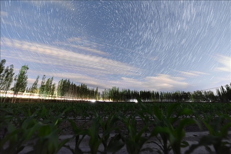 △新疆巴州和靜縣哈爾莫敦鎮(zhèn)查茨村高標(biāo)準(zhǔn)農(nóng)田防護林的夏日星空夜景