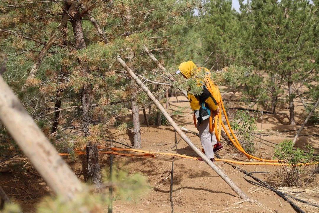 △2023年5月31日,治沙工人在庫布其沙漠億利生態(tài)治理區(qū)內(nèi)搬運水管,準(zhǔn)備為樹木澆水。