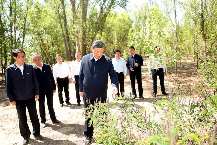 2023年6月5日至6日,中共中央總書記、國家主席、中央軍委主席習(xí)近平在內(nèi)蒙古巴彥淖爾考察,并主持召開加強(qiáng)荒漠化綜合防治和推進(jìn)“三北”等重點(diǎn)生態(tài)工程建設(shè)座談會(huì)。這是6日上午,習(xí)近平在臨河區(qū)國營新華林場(chǎng)考察。新華社記者