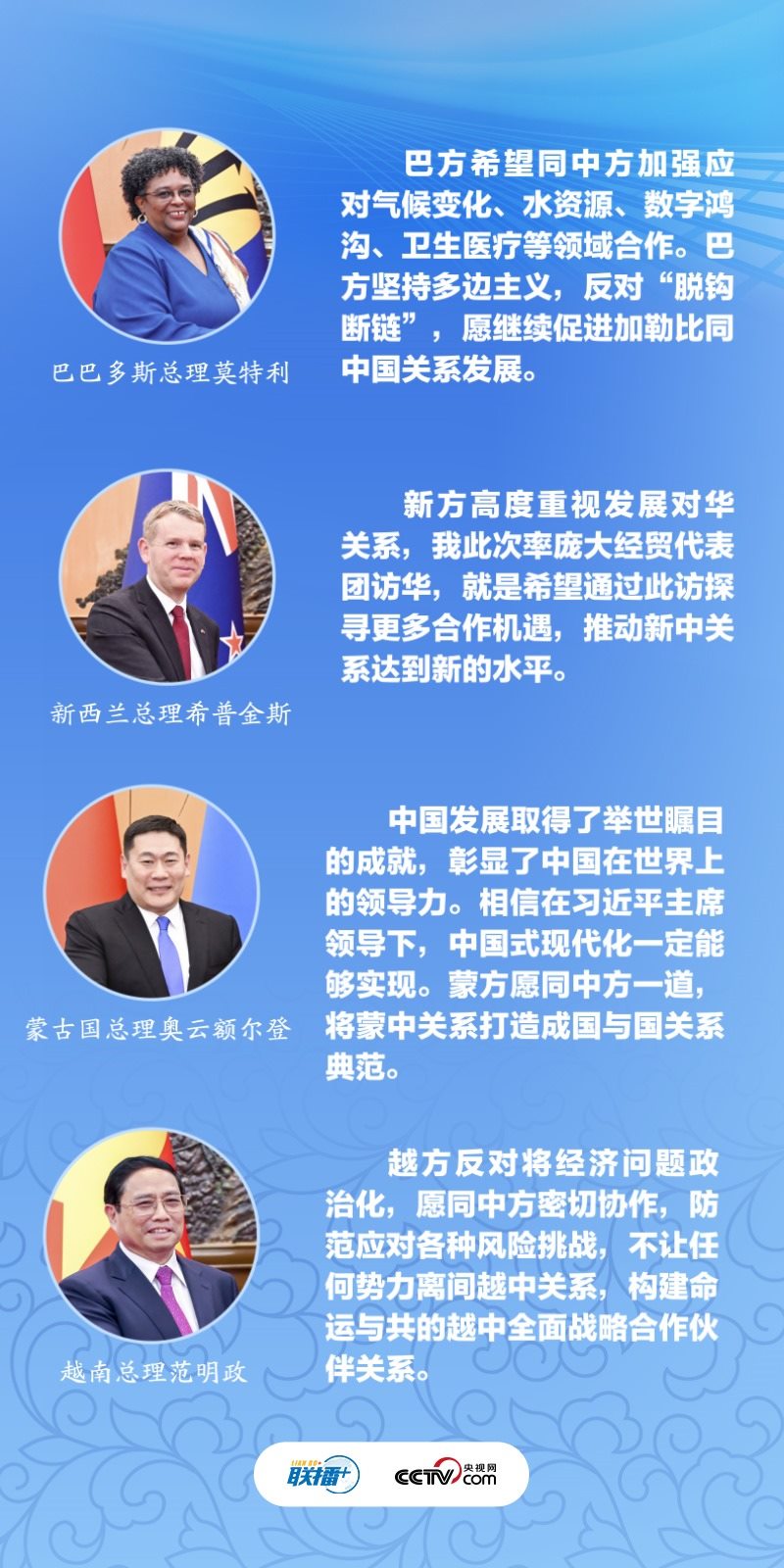 左上圖:6月27日,習(xí)近平會(huì)見巴巴多斯總理莫特利。右上圖:6月27日,習(xí)近平會(huì)見新西蘭總理希普金斯。左下圖:6月27日,習(xí)近平會(huì)見蒙古國總理奧云額爾登。右下圖:6月27日,習(xí)近平會(huì)見越南總理范明政。