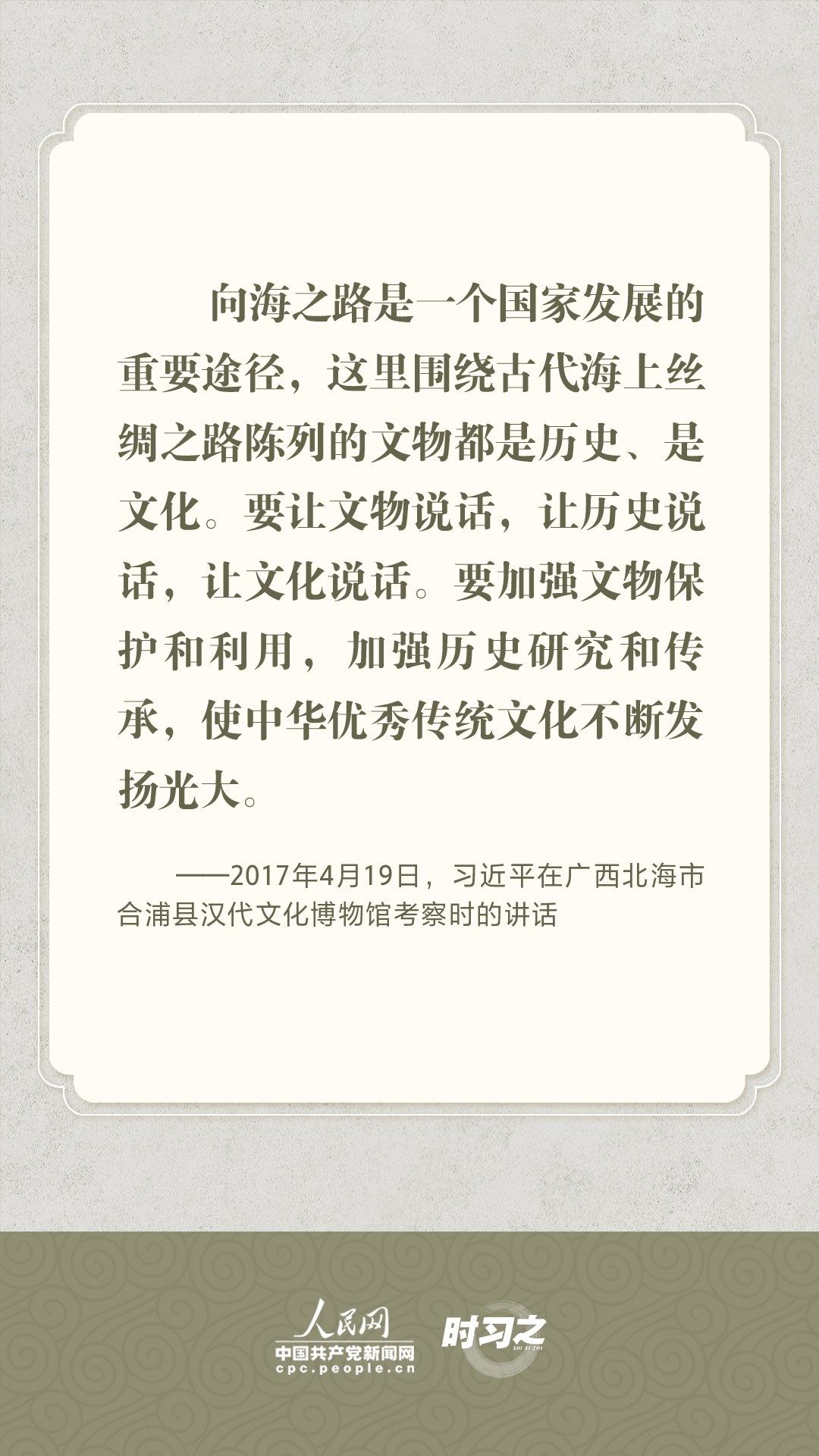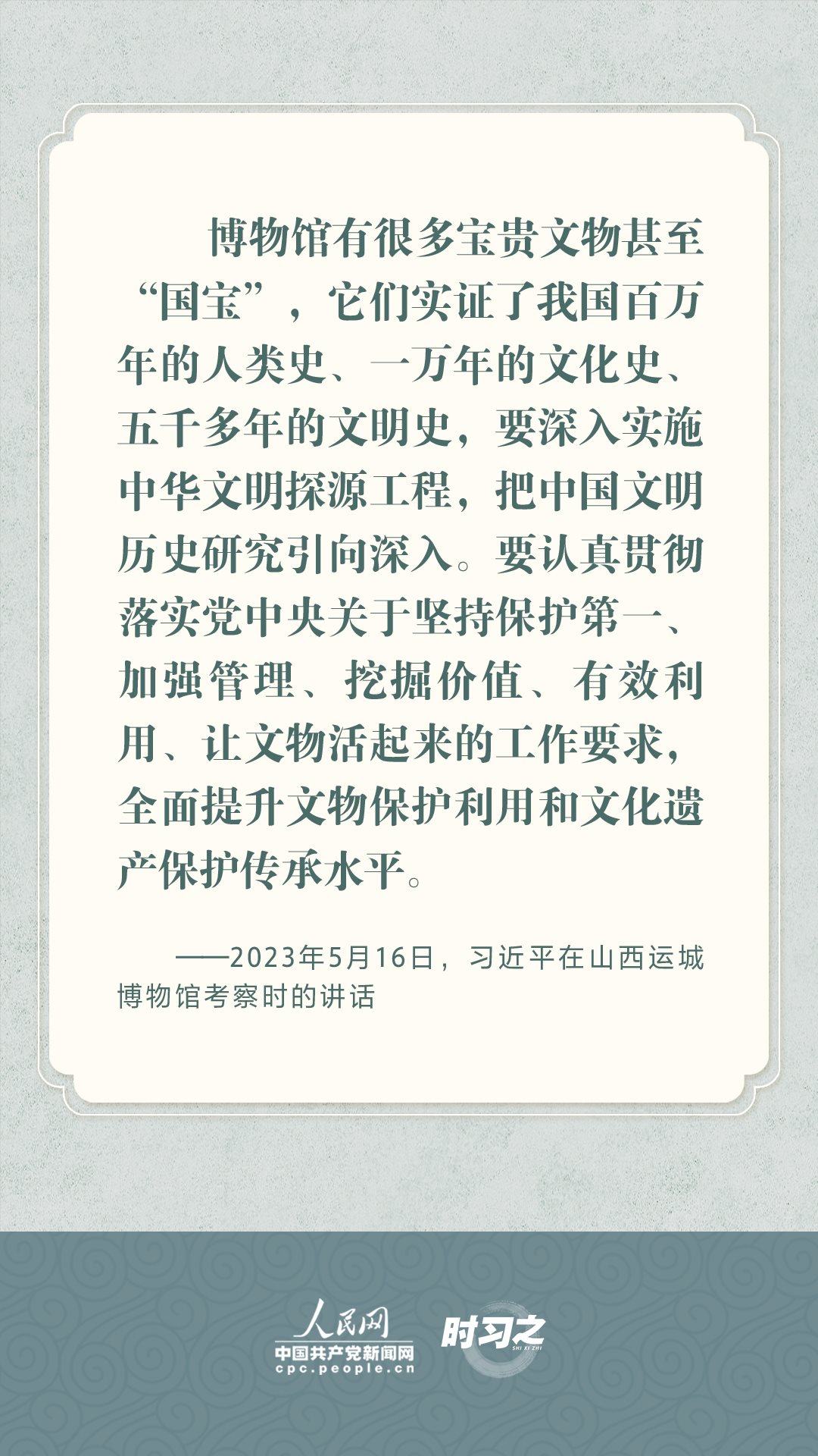 文物承載燦爛文明,傳承歷史文化,維系民族精神。習(xí)近平總書(shū)記站在中華民族和中華文明永續(xù)傳承的戰(zhàn)略高度,不斷強(qiáng)調(diào)保護(hù)傳承中華優(yōu)秀傳統(tǒng)文化,為增強(qiáng)文化自信、激發(fā)中華優(yōu)秀傳統(tǒng)文化的生機(jī)與活力注入了強(qiáng)大精神動(dòng)力。