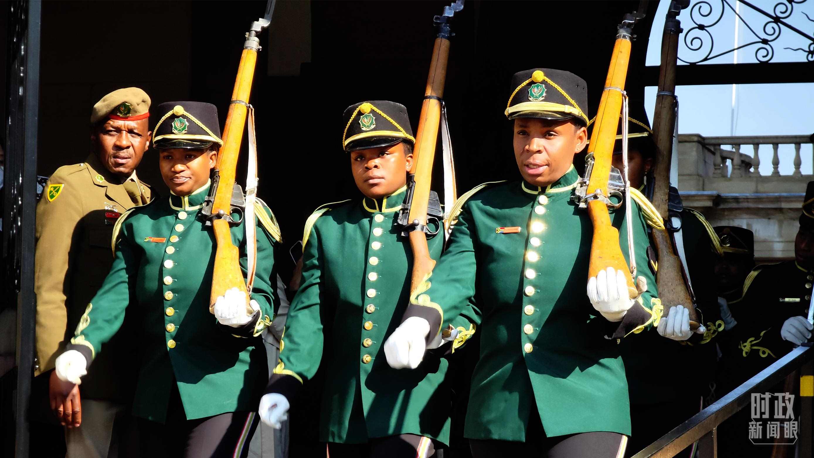 上午,在總統(tǒng)摩托車隊(duì)護(hù)衛(wèi)下,習(xí)主席乘車抵達(dá)總統(tǒng)府,拉馬福薩總統(tǒng)在下車處熱情迎接。兩國元首登上檢閱臺。儀仗隊(duì)行持槍禮,軍樂隊(duì)奏中南兩國國歌,現(xiàn)場鳴放21響禮炮。