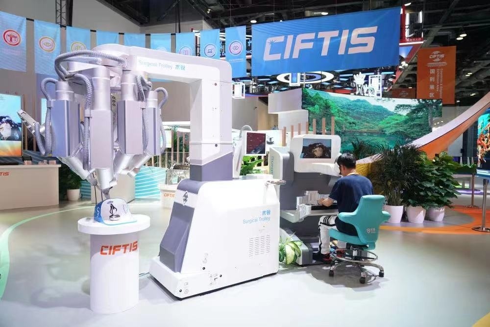△2023年服貿(mào)會國家會議中心綜合展區(qū)展出的單孔腔鏡手術(shù)機(jī)器人