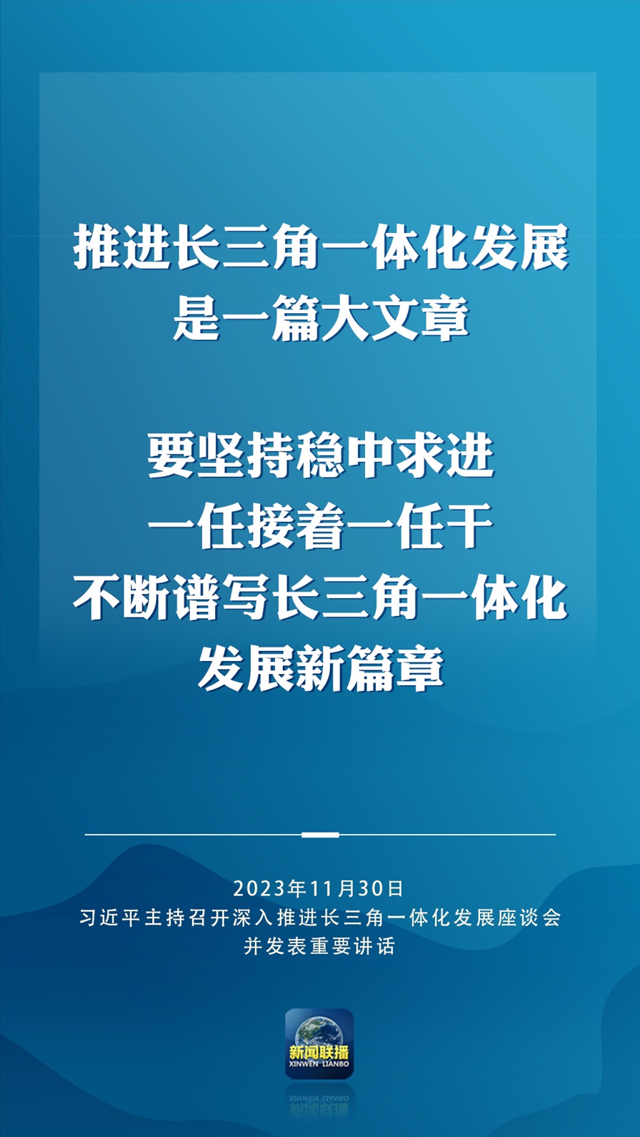 習近平強調,要完整、準確、全面貫徹新發(fā)展理念,緊扣一體化和高質量這兩個關鍵詞,樹立全球視野和戰(zhàn)略思維,堅定不移深化改革、擴大高水平開放,統(tǒng)籌科技創(chuàng)新和產(chǎn)業(yè)創(chuàng)新,統(tǒng)籌龍頭帶動和各揚所長,統(tǒng)籌硬件聯(lián)通和機制協(xié)同,統(tǒng)籌生態(tài)環(huán)保和經(jīng)濟發(fā)展,在推進共同富裕上先行示范,在建設中華民族現(xiàn)代文明上積極探索,推動長三角一體化發(fā)展取得新的重大突破,在中國式現(xiàn)代化中走在前列,更好發(fā)揮先行探路、引領示范、輻射帶動作用。