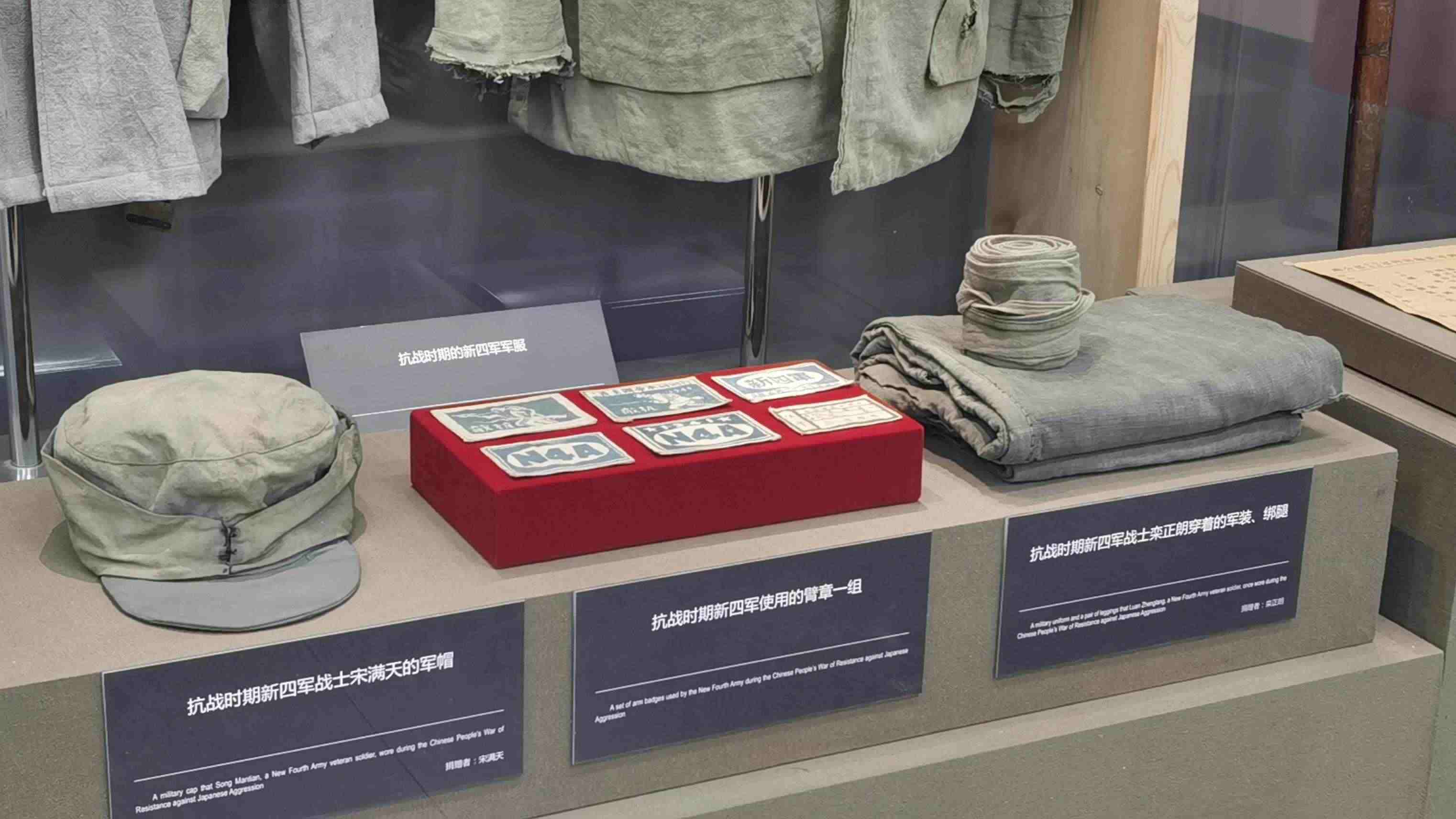△抗戰(zhàn)時期新四軍使用的軍帽、臂章等。(總臺央視記者郭鴻拍攝)