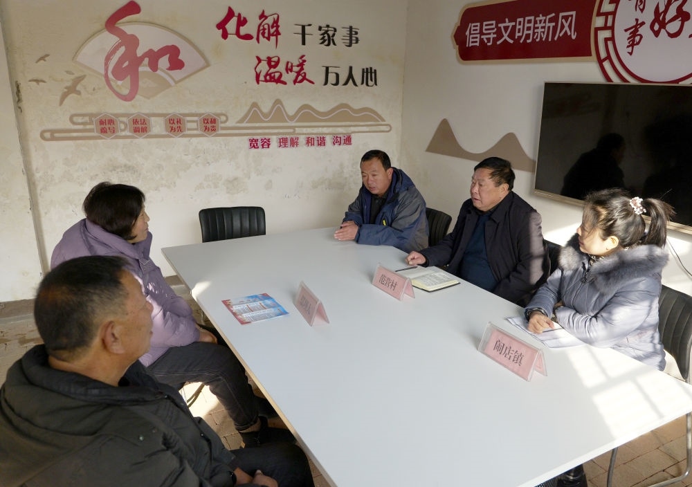 在寶豐縣鬧店鎮(zhèn)范營村“擺理堂”,村鎮(zhèn)干部(右)為村民進(jìn)行信訪調(diào)解(2023年12月20日攝)。河南省寶豐縣積極推進(jìn)四下基層工作深入開展,已打造鬧店鎮(zhèn)范營村“擺理堂”、石橋鎮(zhèn)東大莊村“老娘舅茶室”等系列鄉(xiāng)村社區(qū)服務(wù)陣地,協(xié)調(diào)鄰里關(guān)系,有效化解各類矛盾,同時(shí)不斷豐富工作內(nèi)容,拓展服務(wù)功能,助力鄉(xiāng)村振興。新華社記者 李嘉南 攝