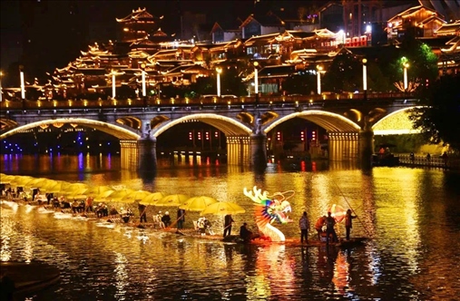同樣迎來(lái)2024年龍年新春燈會(huì)的,還有湖北省恩施州宣恩縣城,這里的龍?jiān)煨蜔艚M格外亮眼,特別是其中一條非常壯觀的“貢水游龍”,龍身由30多只竹筏串聯(lián)而成,總長(zhǎng)度達(dá)到200多米。游客還可以登上龍船觀燈展、賞夜色。隨著金色的巨龍?jiān)诒趟序暄延蝿?dòng),也傳遞著吉祥的寓意。
