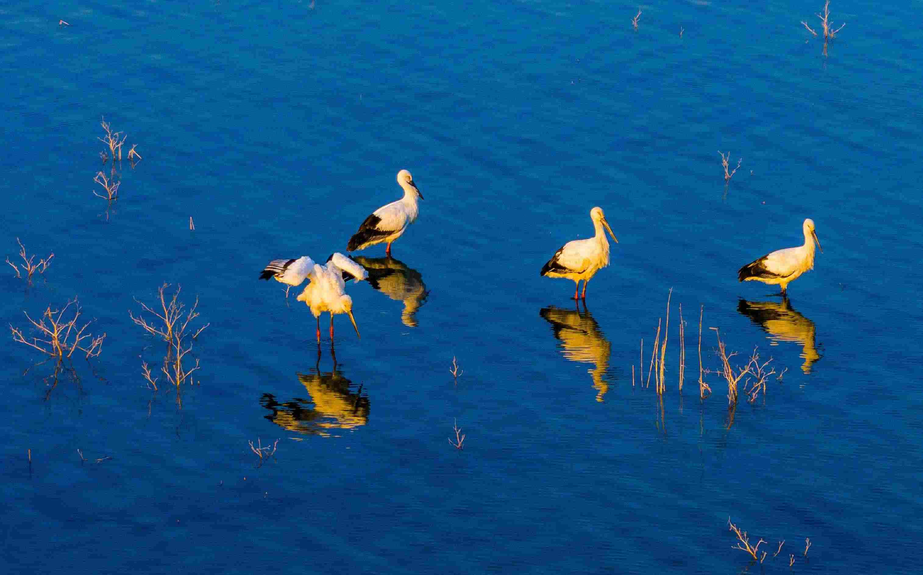 △ 2023年12月1日,安徽淮北,烈山區(qū)化家湖,4只遷徙的國(guó)寶級(jí)野生動(dòng)物東方白鸛在休憩、覓食。