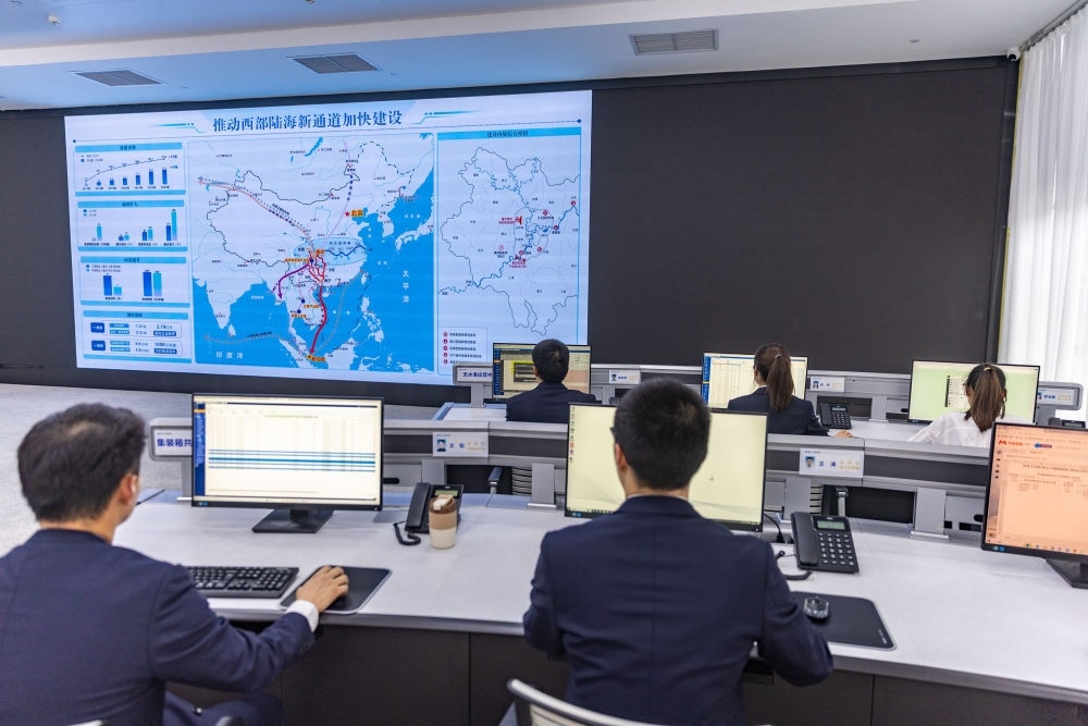 2024年4月22日,工作人員在西部陸海新通道運(yùn)營調(diào)度中心工作。工作人員可以在大屏上實(shí)時(shí)了解班列在邊境口岸的出入境信息。