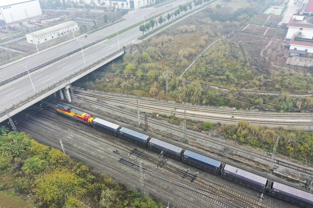 2023年1月22日,一趟西部陸海新通道鐵海聯(lián)運(yùn)班列從重慶團(tuán)結(jié)村中心站發(fā)車(無人機(jī)照片)。班列滿載著汽車、摩托車、發(fā)動機(jī)和純堿等共計(jì)100個集裝箱的貨物,將經(jīng)廣西欽州港換乘海船去往印度尼西亞、菲律賓、喀麥隆、澳大利亞等國家和地區(qū)。