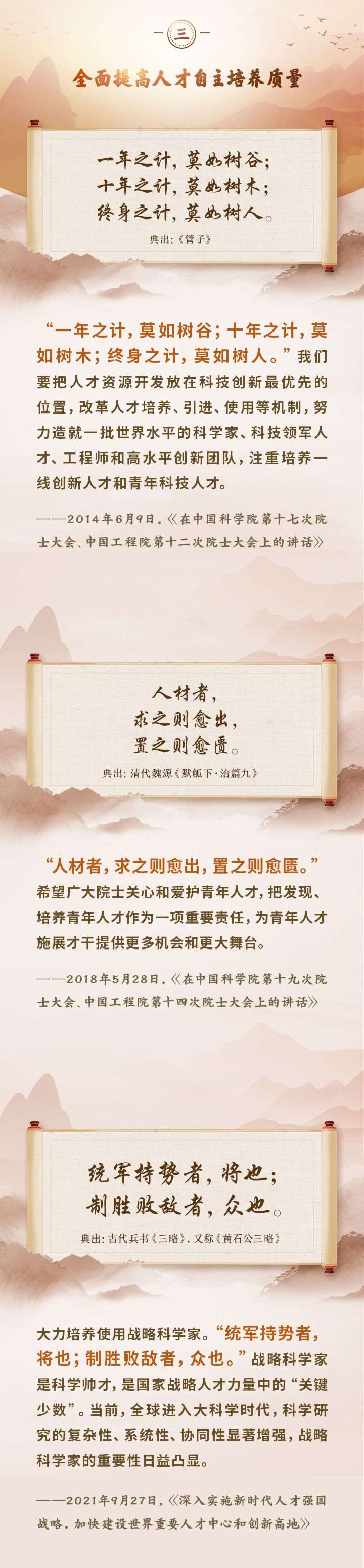 編者按:培養(yǎng)造就大批德才兼?zhèn)涞母咚刭|人才,是國家和民族長遠發(fā)展大計。黨的十八大以來,習近平總書記圍繞人才工作發(fā)表一系列重要論述,立意高遠,內(nèi)涵豐富,思想深刻,深刻回答了為什么建設人才強國、什么是人才強國、怎樣建設人才強國的重大理論和實踐問題。在這些重要論述中,總書記精妙運用古代典籍、經(jīng)典名句,以古喻今、啟迪思想、激蕩精神,讓我們一起來學習!