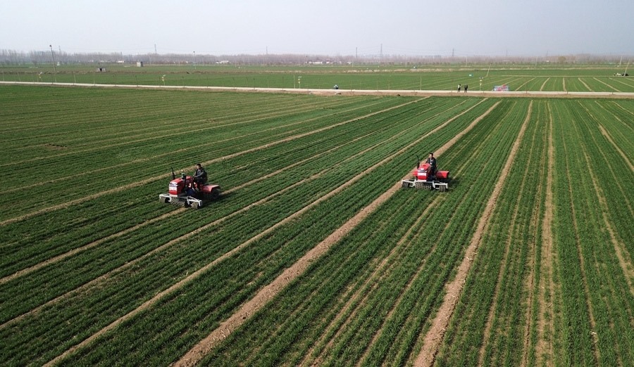 山東省汶上縣,農(nóng)民駕駛農(nóng)機在高標(biāo)準(zhǔn)農(nóng)田里進行小麥春季管護作業(yè)(2024年3月13日攝,無人機照片)。新華社記者 徐速繪 攝