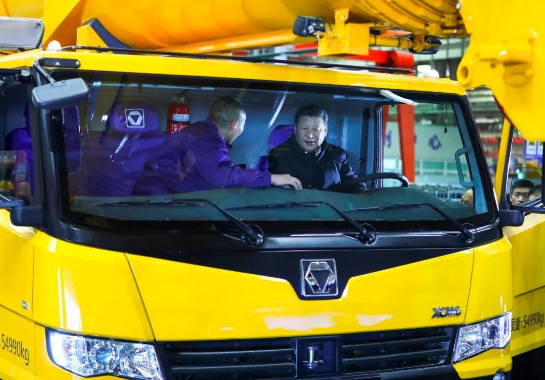 △2017年12月12日,習(xí)近平總書記在江蘇徐州徐工集團(tuán)坐進(jìn)剛下線的XCA220型全地面起重機駕駛室,向技術(shù)人員詳細(xì)詢問起重機的性能、產(chǎn)量、價格等。
