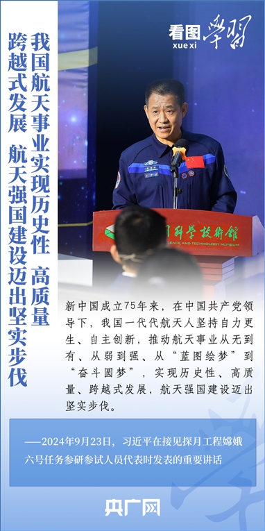 中國(guó)探月工程成果凝結(jié)著我國(guó)幾代航天人的智慧和心血。9月23日,習(xí)近平總書記接見探月工程嫦娥六號(hào)任務(wù)參研參試人員代表并發(fā)表重要講話??倳浉叨瓤隙ㄦ隙鹆?hào)任務(wù)成功的重要意義,以及探月工程為我國(guó)航天事業(yè)發(fā)展、為人類探索宇宙空間作出的重大貢獻(xiàn),勉勵(lì)航天戰(zhàn)線工作者再接再厲、乘勢(shì)而上,為建設(shè)航天強(qiáng)國(guó)再立新功。一起來(lái)學(xué)習(xí)!