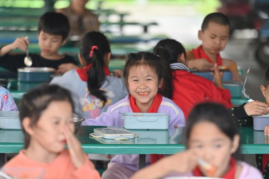 5月31日,廣西柳州市柳江區(qū)三都鎮(zhèn)覺山教學(xué)點(diǎn),學(xué)生們在吃營養(yǎng)午餐。