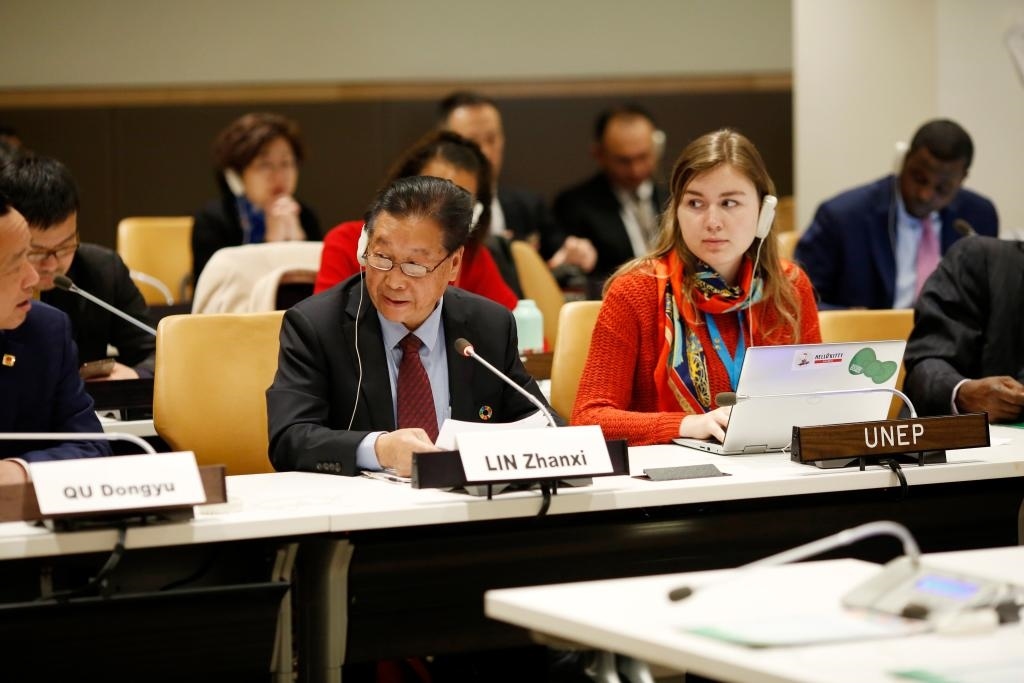 2019年4月18日,在位于紐約的聯(lián)合國(guó)總部,林占熺(前排中)在“菌草技術(shù):‘一帶一路’倡議對(duì)促進(jìn)落實(shí)聯(lián)合國(guó)2030年可持續(xù)發(fā)展議程的實(shí)質(zhì)性貢獻(xiàn)”專題研討會(huì)上發(fā)言。新華社記者 李木子 攝