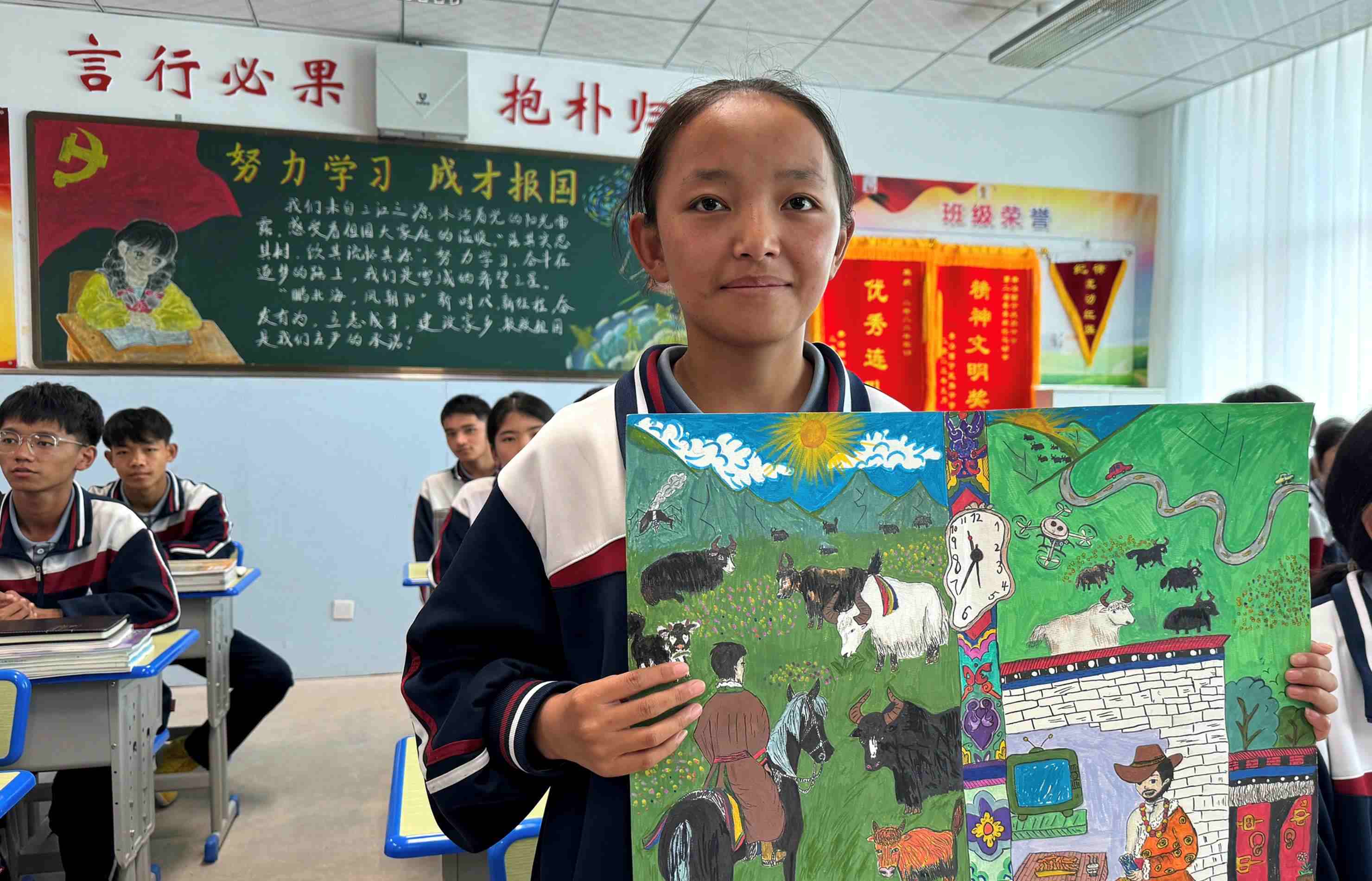 △果洛西寧民族中學(xué)學(xué)生尼東拉毛在主題思政課上展示表現(xiàn)現(xiàn)代化家鄉(xiāng)的作品。