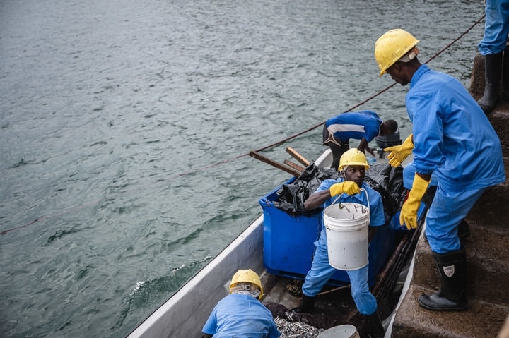 工作人員在肯尼亞夸萊郡希莫尼鎮(zhèn)一處港口搬運(yùn)新捕撈的鳀魚(yú)(2023年6月22日攝)。新華社記者 王冠森 攝