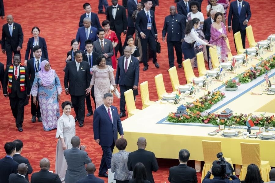△2024年9月5日,習近平主席在北京人民大會堂出席中非合作論壇北京峰會開幕式并發(fā)表主旨講話。這是習近平主席同外方領(lǐng)導人共同步入會場。
