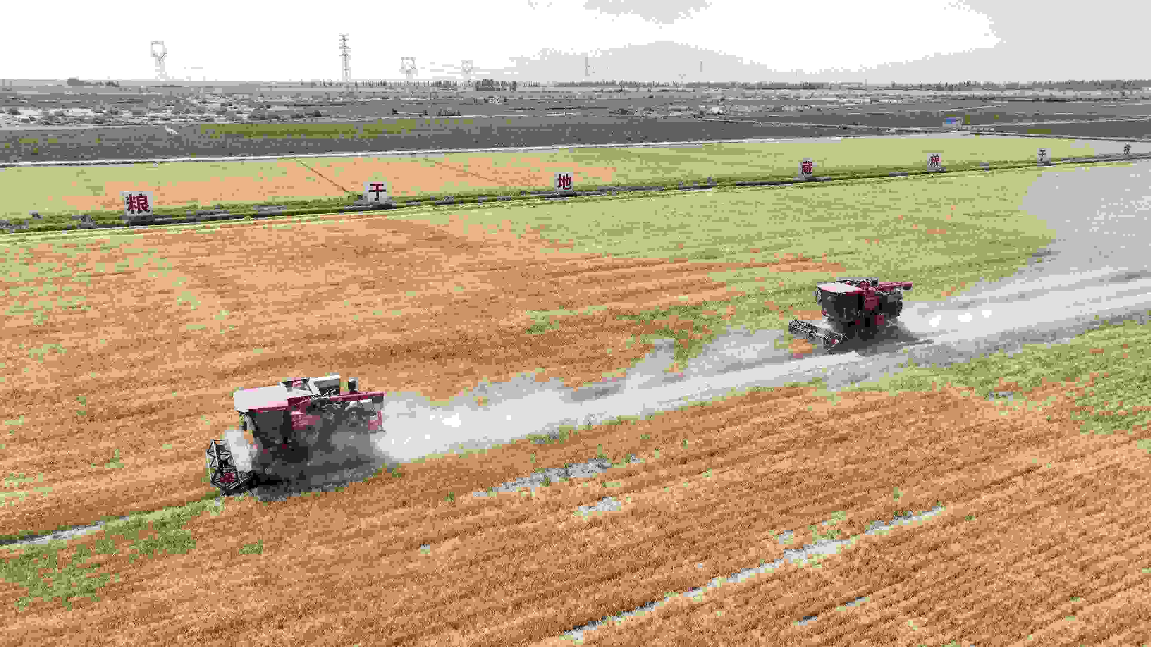 △2024年7月10日,在甘肅省酒泉市金塔縣東壩鎮(zhèn)小河口村中度鹽堿耕地綜合治理利用示范點(diǎn),1000余畝鹽堿地小麥喜獲豐收。