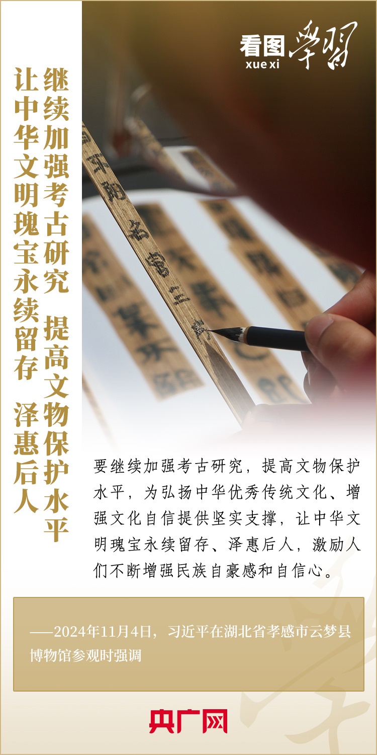 11月4日,習(xí)近平總書(shū)記在湖北省孝感市云夢(mèng)縣博物館參觀出土秦漢簡(jiǎn)牘展。這里收藏的我國(guó)考古史上首次發(fā)現(xiàn)的秦簡(jiǎn)——云夢(mèng)睡虎地秦簡(jiǎn),反映了戰(zhàn)國(guó)晚期到秦始皇時(shí)期的政治、經(jīng)濟(jì)、文化、法律、軍事等方面的情況。習(xí)總書(shū)記詳細(xì)聽(tīng)取簡(jiǎn)牘內(nèi)容、歷史文化價(jià)值和保護(hù)研究情況介紹,指出要繼續(xù)加強(qiáng)考古研究,提高文物保護(hù)水平,讓中華文明瑰寶永續(xù)留存、澤惠后人。