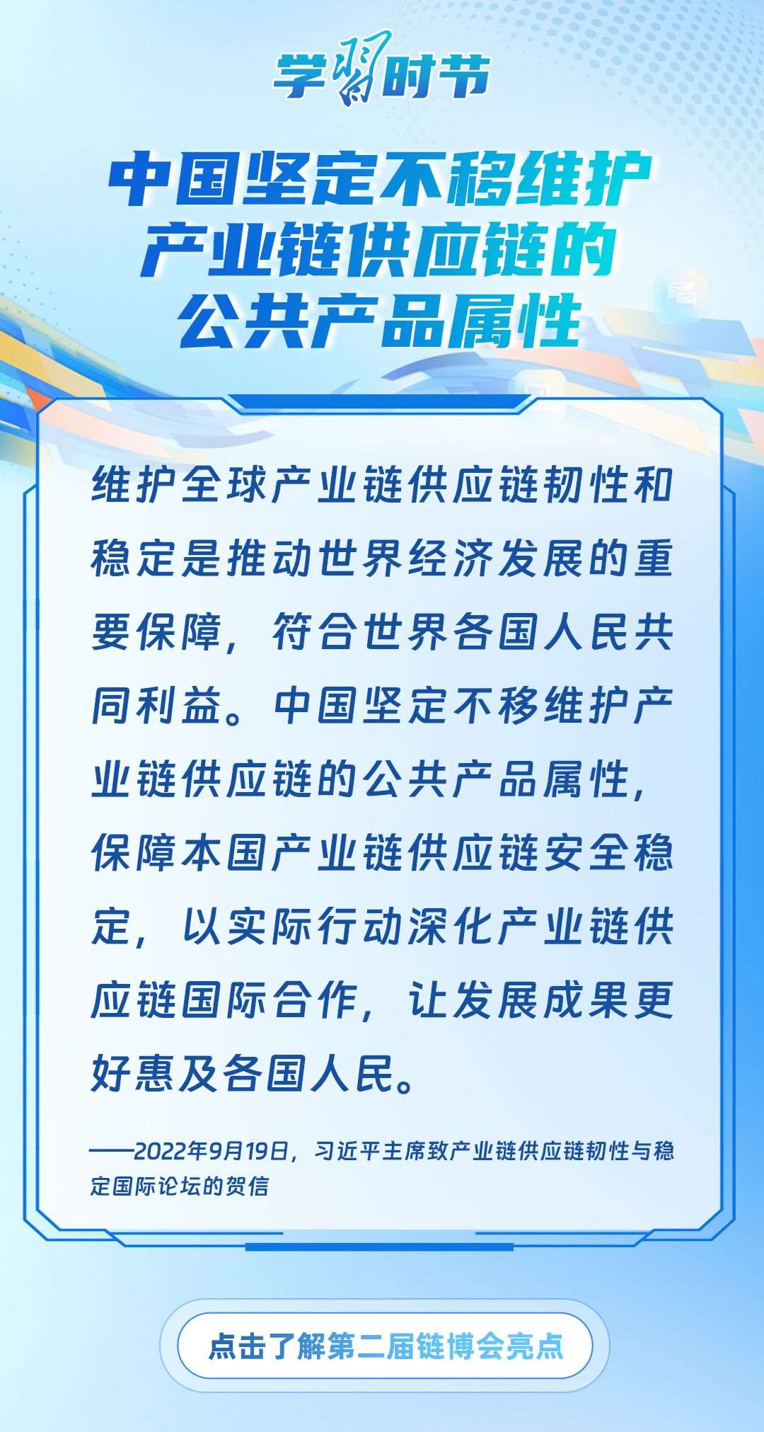 習(xí)近平主席心系產(chǎn)業(yè)鏈供應(yīng)鏈安全穩(wěn)定,多次強(qiáng)調(diào)中國(guó)將以實(shí)際行動(dòng)維護(hù)全球產(chǎn)業(yè)鏈供應(yīng)鏈安全穩(wěn)定,為世界各國(guó)共同構(gòu)筑安全穩(wěn)定、暢通高效、開放包容、互利共贏的全球產(chǎn)業(yè)鏈供應(yīng)鏈體系提供中國(guó)方案。習(xí)近平主席曾在多個(gè)重要場(chǎng)合對(duì)此作出一系列深刻闡述,讓我們一起學(xué)習(xí)。
