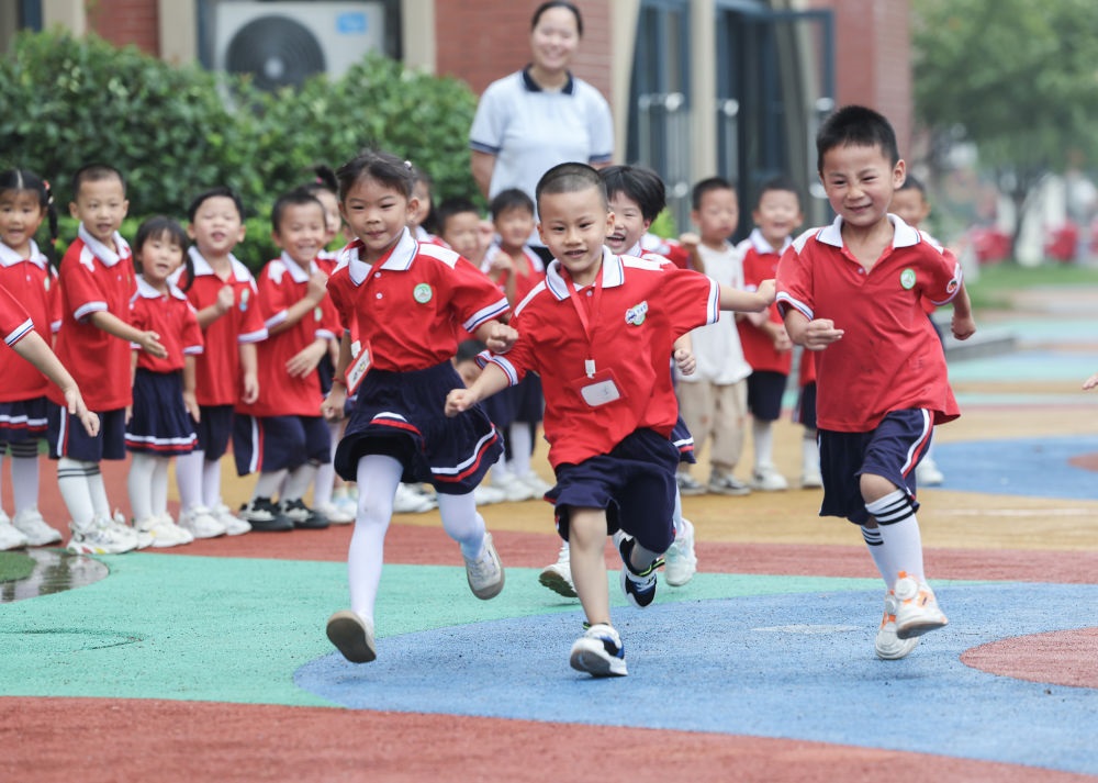 2024年9月26日,孩子們?cè)谡憬『菔虚L興縣開發(fā)區(qū)中心幼兒園參加趣味追逐游戲。新華社記者 徐昱 攝
