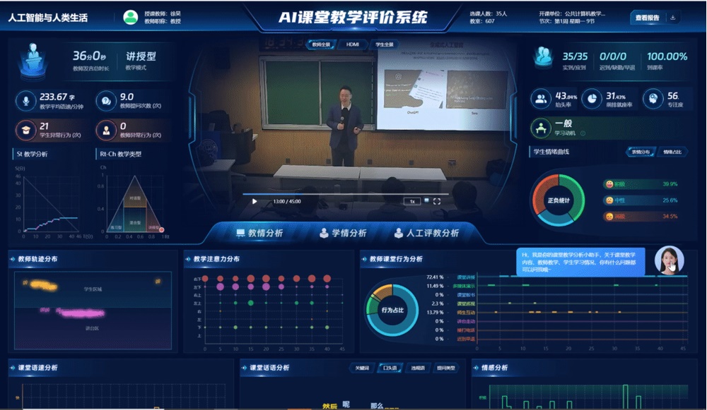 “您講授的‘人工智能與人類生活’課程質(zhì)量很高,但您的口頭語(yǔ)比較頻繁……”報(bào)告共有教學(xué)內(nèi)容、教學(xué)方法、師生行為等28項(xiàng)指標(biāo),還會(huì)針對(duì)提升教學(xué)質(zhì)量給出合理建議。