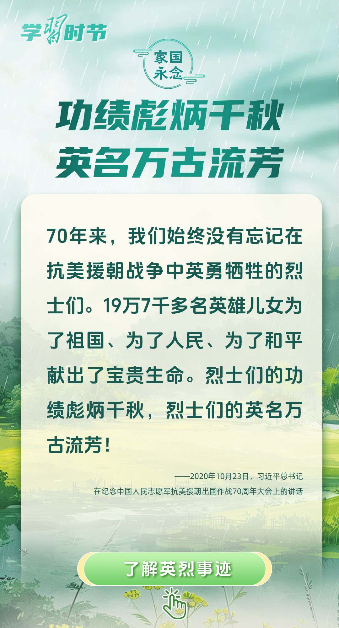 今年是中國人民抗日戰(zhàn)爭暨世界反法西斯戰(zhàn)爭勝利80周年、中國人民志愿軍抗美援朝出國作戰(zhàn)75周年。習(xí)近平總書記曾說:“對一切為國家、為民族、為和平付出寶貴生命的人們,不管時(shí)代怎樣變化,我們都要永遠(yuǎn)銘記他們的犧牲和奉獻(xiàn)。”今天我們所擁有的一切,無不凝結(jié)著英雄、英烈們的奉獻(xiàn)付出乃至巨大犧牲。