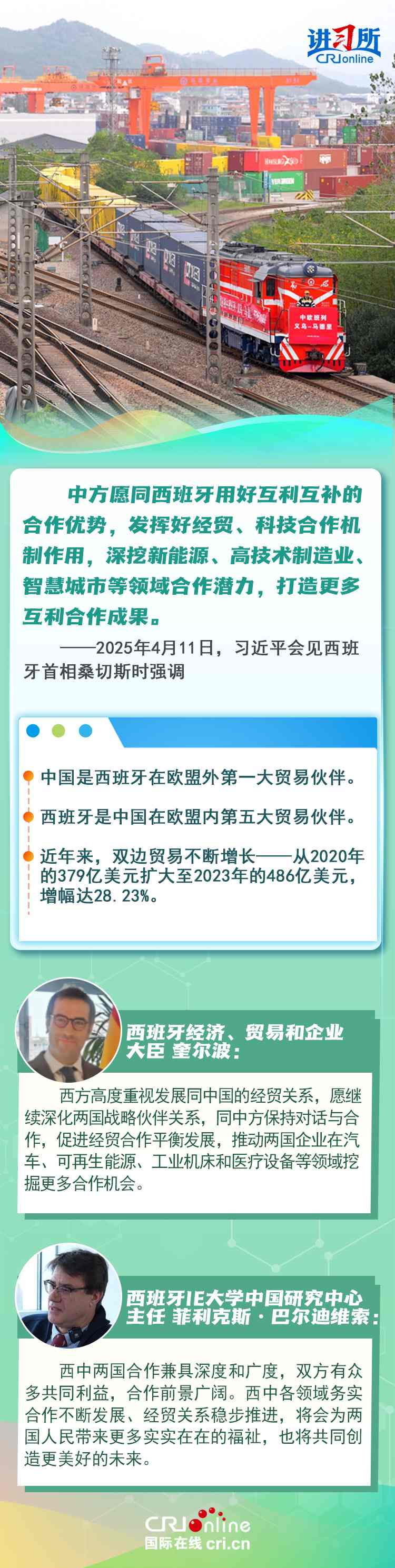 今年是中西全面戰(zhàn)略伙伴關(guān)系建立20周年,也是中歐建交50周年。多年來,中西兩國領(lǐng)導(dǎo)人保持密切互動(dòng),秉持互尊互信、互利共贏精神,兩國在深化貿(mào)易、投資、科技創(chuàng)新、綠色能源等領(lǐng)域取得豐富合作成果,雙邊關(guān)系走在中國同歐洲國家關(guān)系前列。在西班牙人士眼中,良好的對(duì)華關(guān)系對(duì)西班牙、歐洲和世界具有重要意義,將會(huì)為兩國人民帶來更多實(shí)實(shí)在在的福祉,也將共同創(chuàng)造更美好的未來。