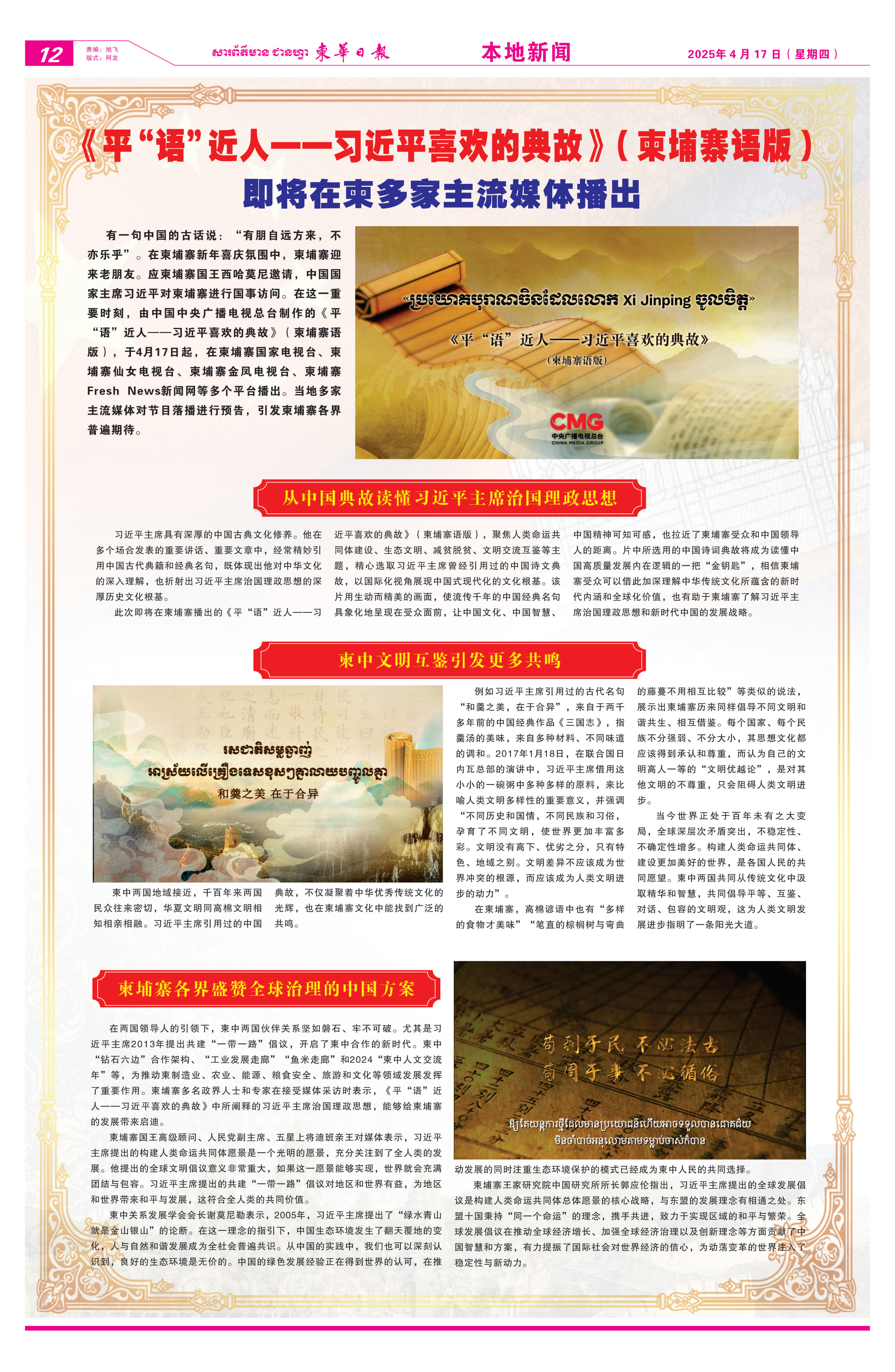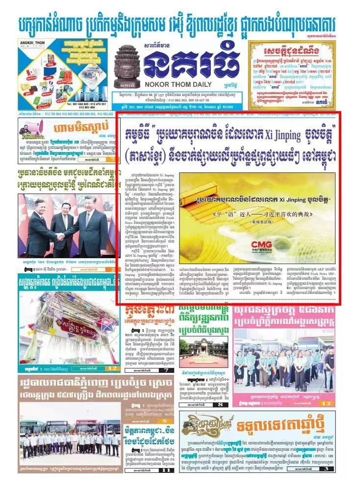 4月12日至17日,《柬華日報》《大都市報》等當?shù)貓蠹埧l(fā)節(jié)目播出預告消息。文章指出,《平“語”近人——習近平喜歡的典故》(柬埔寨語版)是一把讀懂中國高質(zhì)量發(fā)展內(nèi)在邏輯的“金鑰匙”,相信柬埔寨受眾可以通過這些中國古籍和經(jīng)典名句加深理解中華優(yōu)秀傳統(tǒng)文化所蘊含的新時代內(nèi)涵和全球化價值,了解習近平主席治國理政思想和新時代中國的發(fā)展戰(zhàn)略。