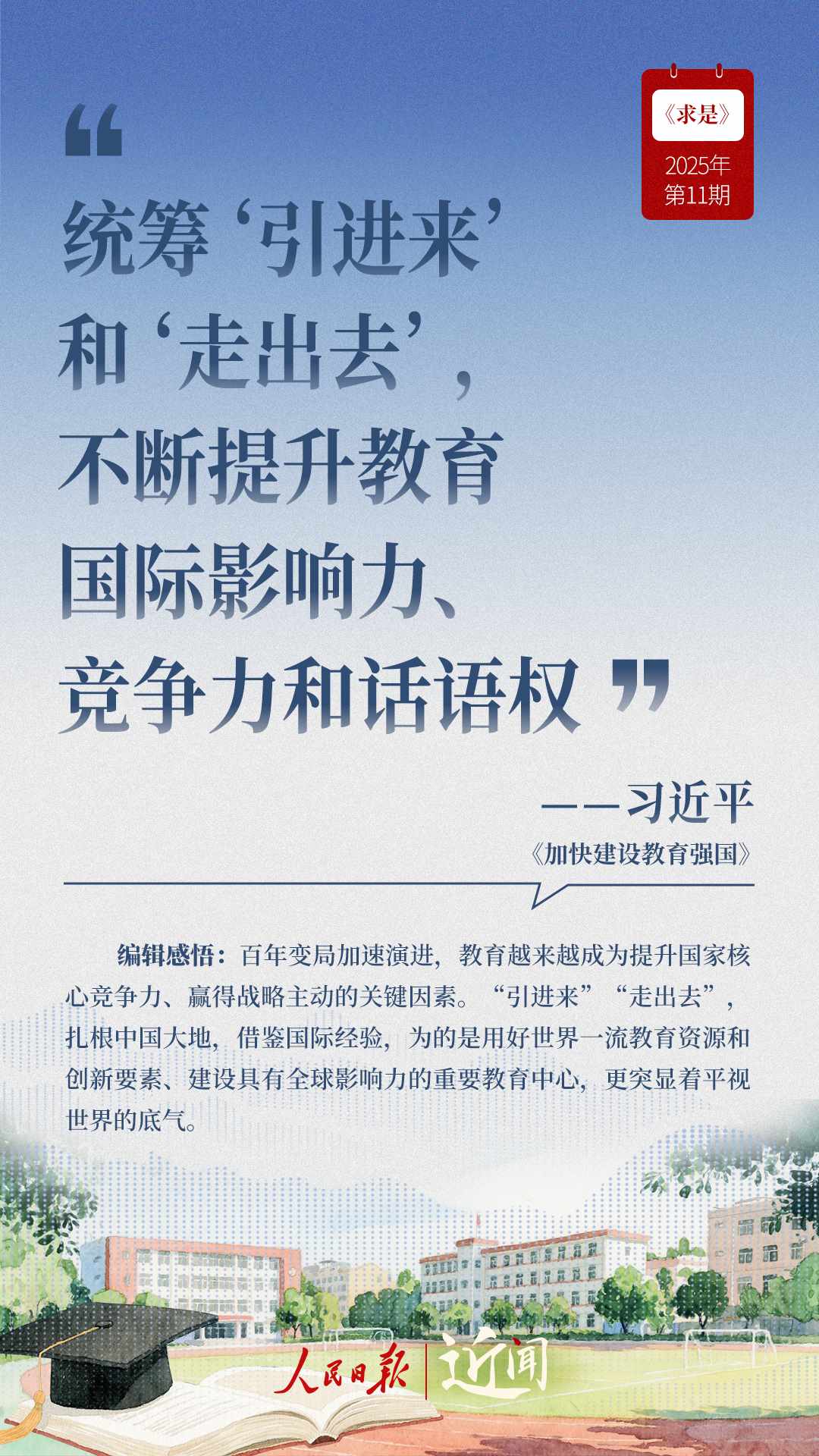 教育是國之大計、黨之大計。日前,《求是》雜志發(fā)表習近平總書記重要文章《加快建設(shè)教育強國》。“全面把握教育的政治屬性、人民屬性、戰(zhàn)略屬性”“讓教育改革發(fā)展成果更多更公平惠及全體人民”“讓教師享有崇高社會聲望、成為最受社會尊重的職業(yè)之一”……通過這些話,一起感悟習近平總書記對教育強國建設(shè)的謀劃與部署。