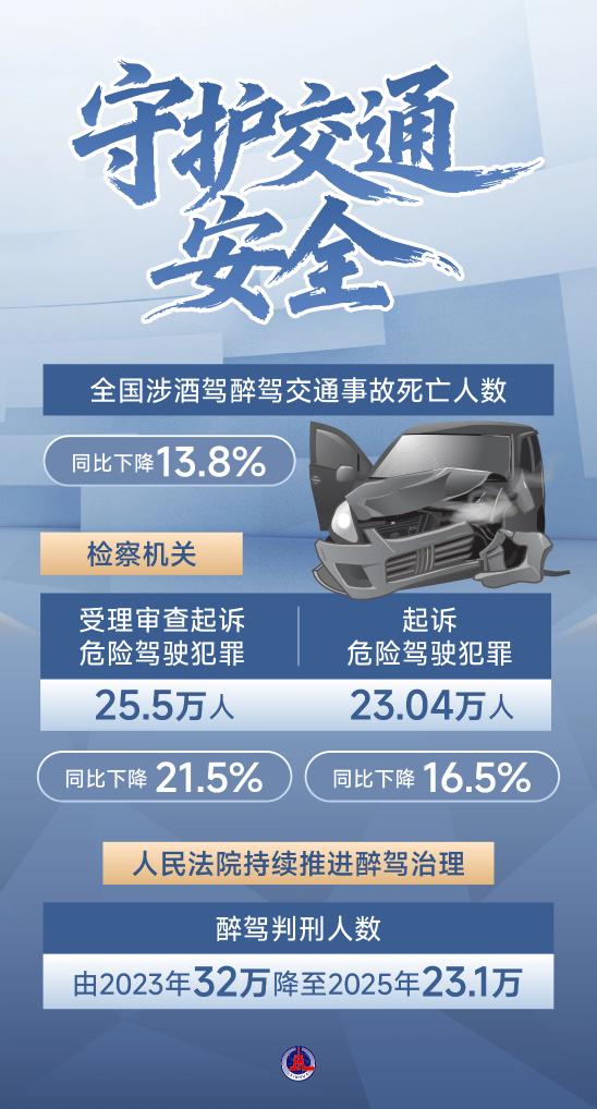 最高法報(bào)告指出,辦理醉駕刑事案件意見出臺后,判刑人數(shù)由2023年32萬降至2025年23.1萬,因酒駕造成交通事故及致死、致傷數(shù)量均有下降。同時(shí),明確“駕駛?cè)俗砭坪髥⒂幂o助駕駛功能仍應(yīng)承擔(dān)刑事責(zé)任”?! ?/p>