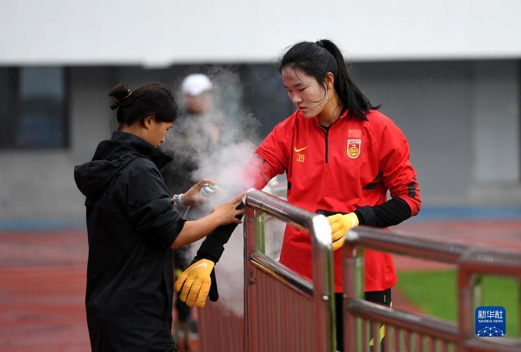 7月12日,守門員潘紅艷(右)在訓(xùn)練中接受治療。新華社記者 李紫恒 攝