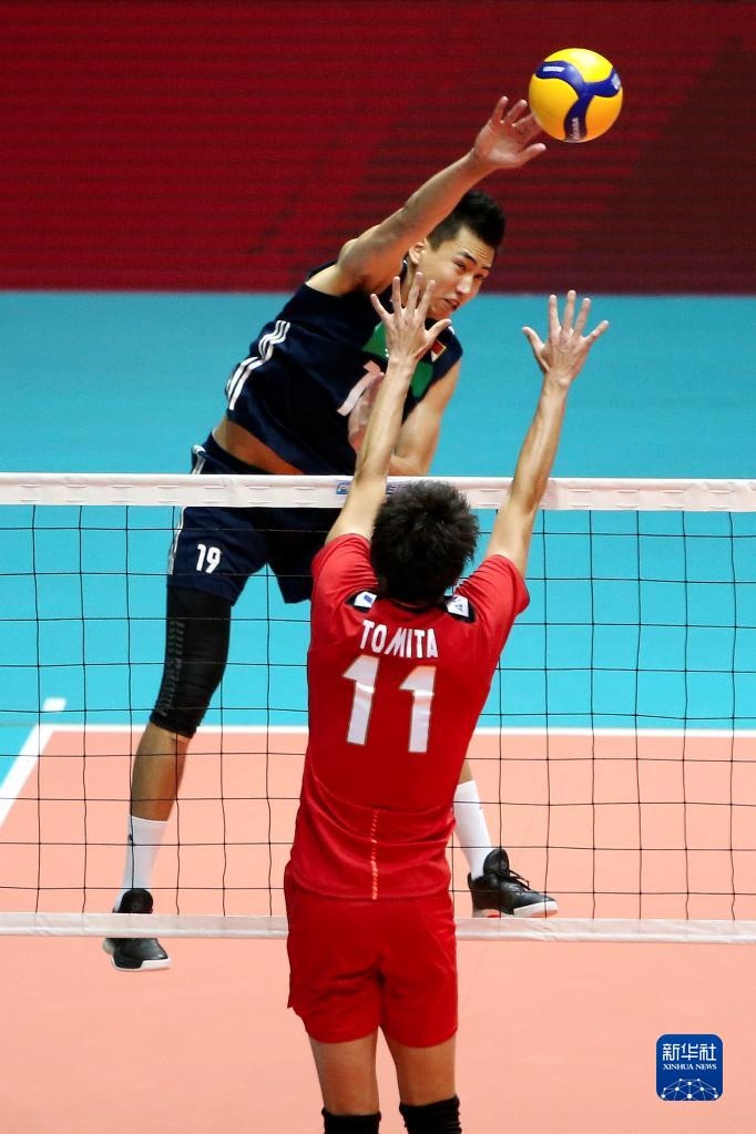 8月14日,中國(guó)隊(duì)球員張景胤(右一)在比賽中扣球。新華社記者 王騰 攝