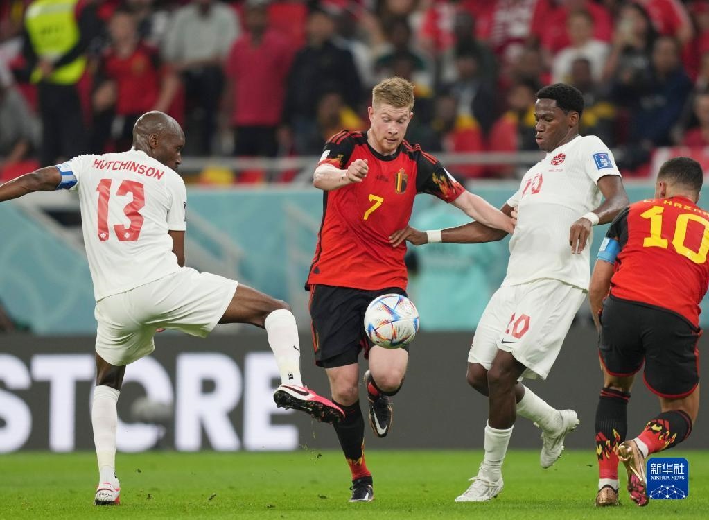 11月23日,比利時隊球員德布勞內(nèi)(左二)在比賽中進(jìn)攻。新華社記者 李鋼 攝