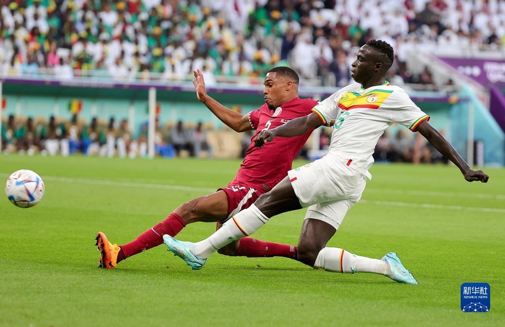11月25日,塞內(nèi)加爾隊(duì)球員迪亞塔與卡塔爾隊(duì)球員佩德羅·米格爾拼搶。新華社記者 王東震 攝
