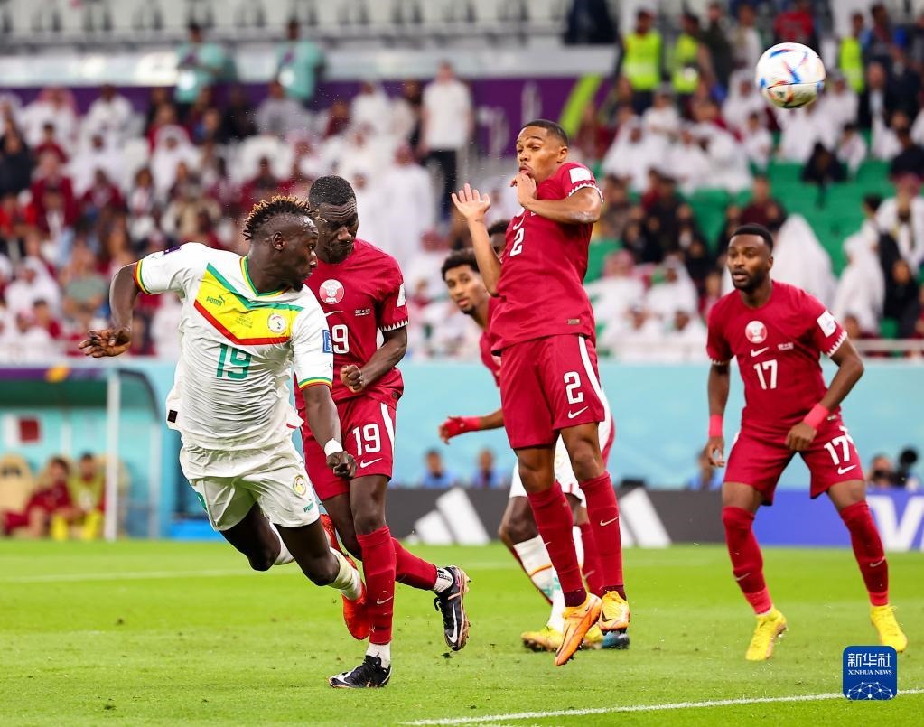 11月25日,塞內(nèi)加爾隊(duì)球員迪德希歐(左一)頭球破門(mén),取得球隊(duì)第二粒進(jìn)球。新華社記者 丁旭 攝