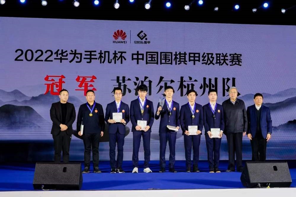 蘇泊爾杭州隊(duì)在2022華為手機(jī)杯中國(guó)圍棋甲級(jí)聯(lián)賽頒獎(jiǎng)儀式上。