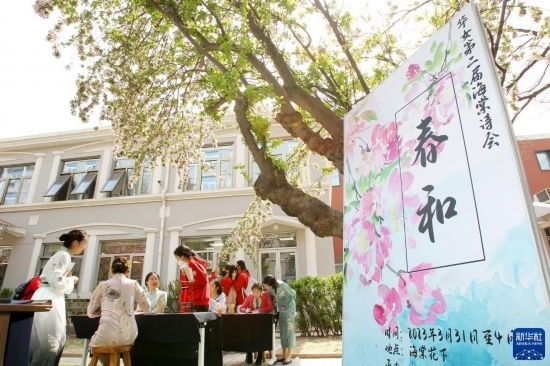 當(dāng)日,北師大實(shí)驗(yàn)華夏女子中學(xué)舉辦以“春和”為主題的第二屆“海棠詩會(huì)”。師生們選取有關(guān)“春天”“和煦”“生機(jī)”“美好”的詩歌,在校園的海棠樹下賞析吟誦,共享詩歌之美,傳承中華優(yōu)秀傳統(tǒng)文化。