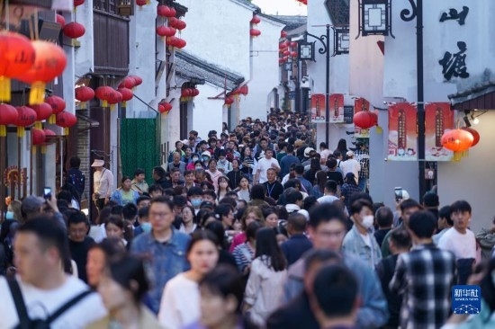 游客在江蘇蘇州山塘街休閑游玩(4月10日攝,無人機(jī)照片)。