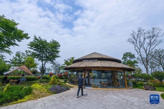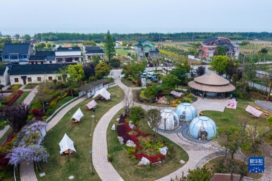 4月11日拍攝的伍浦村漁耕文化園的陶灣里鄉(xiāng)村咖啡店以及鄉(xiāng)村露營地(無人機(jī)照片)。