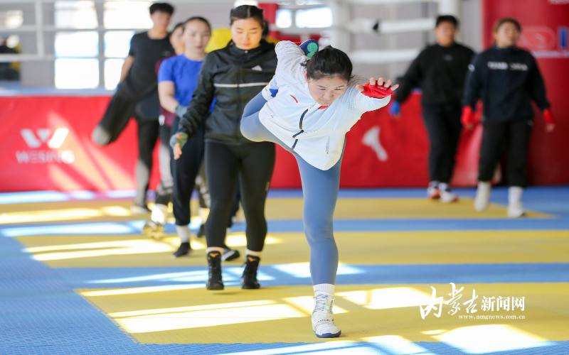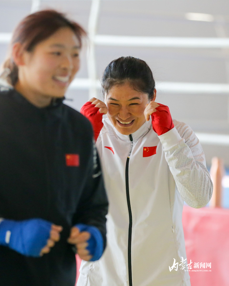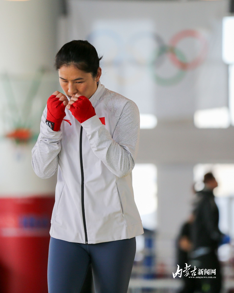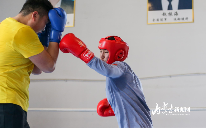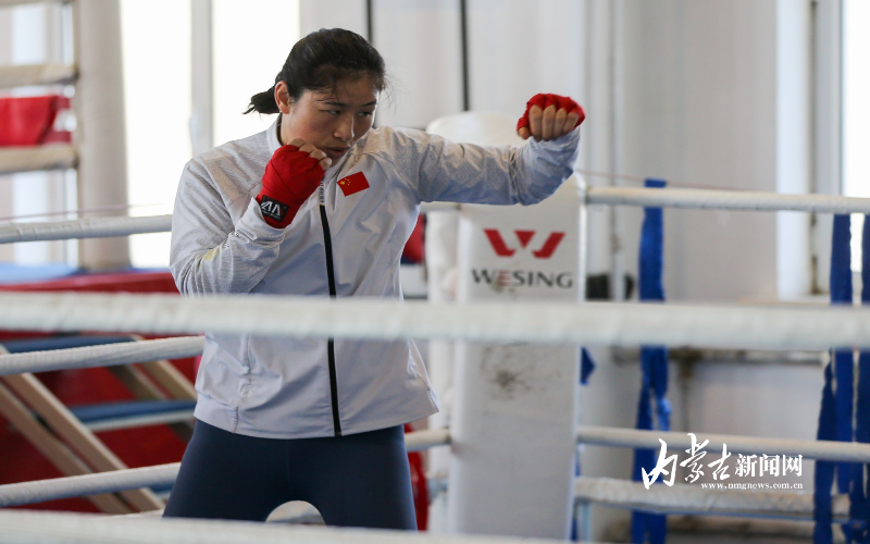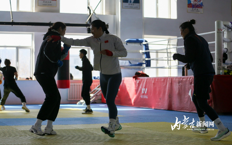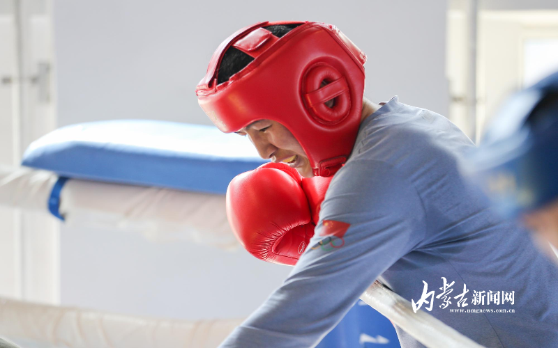當日,記者在拳擊館內看到,在訓練中李倩腳步輕盈,汗珠在額頭滑落。她戴上拳套,走向沙袋,一記記重拳砸出,發(fā)出沉悶的“砰”聲。內蒙古女子拳擊隊的數(shù)十名拳手正在同時訓練,沙袋晃動,呼吸急促,空氣中彌漫著汗水與堅持的味道?!胺朗?,腳下要穩(wěn)!”內蒙古拳擊隊總教練哈達巴特爾的聲音在空間回蕩。李倩的訓練格外嚴格。除了常規(guī)力量訓練、反應訓練和體能循環(huán),她還要進行一對一的與男拳手的實戰(zhàn)模擬,幾次交鋒下來,氣息都愈發(fā)急促。但李倩沒有退縮,反而越打越穩(wěn),腳步靈活,出拳干凈利落。