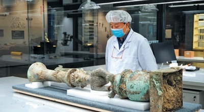 文物修復(fù)四川省文物考古研究院三星堆遺址工作站站長(zhǎng)雷雨在查看拼對(duì)成功的鳥(niǎo)足曲身頂尊神像。新華社記者 肖 林?jǐn)z