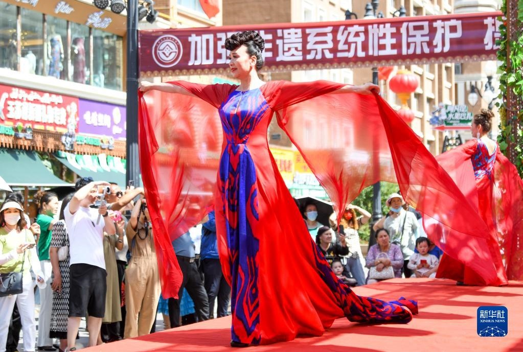 烏魯木齊開展非物質(zhì)文化遺產(chǎn)展示展演展銷活動(dòng) 6月9日,在烏魯木齊大巴扎景區(qū),模特在活動(dòng)現(xiàn)場展示艾......