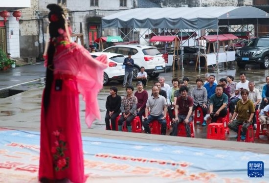 6月25日,澧浦鎮(zhèn)鄭店村百姓在觀看光南文化禮堂大舞臺(tái)上婺之靈坐唱班表演的婺劇(無(wú)人機(jī)照片)。