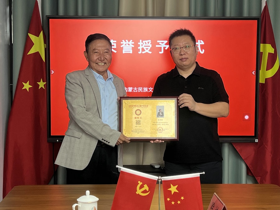 9月24日,受北京華夏文明東方非物質(zhì)文化遺產(chǎn)保護(hù)中心世界非物質(zhì)文化遺產(chǎn)研究院的委托,內(nèi)蒙古民族文化藝術(shù)研究院院長(zhǎng)殷福軍、北疆文化品牌研究中心主任哈達(dá),為內(nèi)蒙古民族文化藝術(shù)研究院研究員、非物質(zhì)文化遺產(chǎn)研究所所長(zhǎng)包文臻,頒發(fā)世界非物質(zhì)文化遺產(chǎn)研究院副院長(zhǎng)證書(shū)和牌匾。