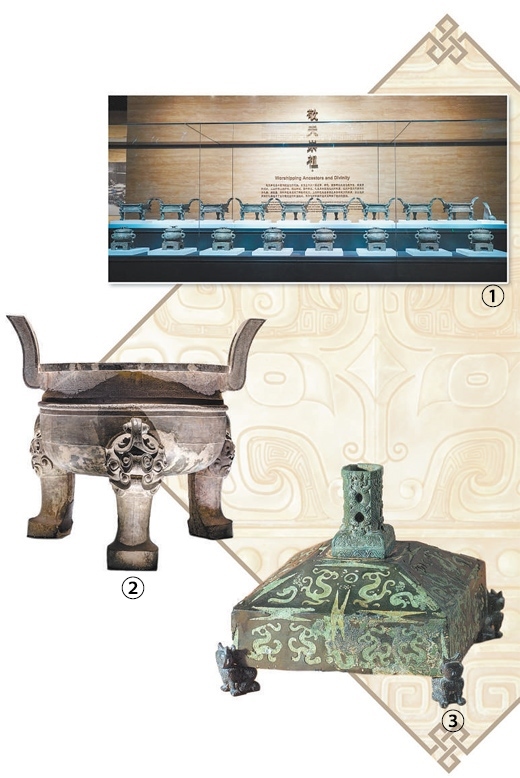 圖①:隨州曾侯乙墓出土的九鼎八簋。圖②:安徽博物院藏鑄客大鼎。圖③:紹興坡塘獅子山306號墓出土的方座形器。以上圖片均為張昌平提供