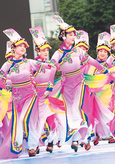 在四川省北川羌族自治縣新生廣場,羌族學(xué)生跳沙朗舞歡慶羌?xì)v新年。